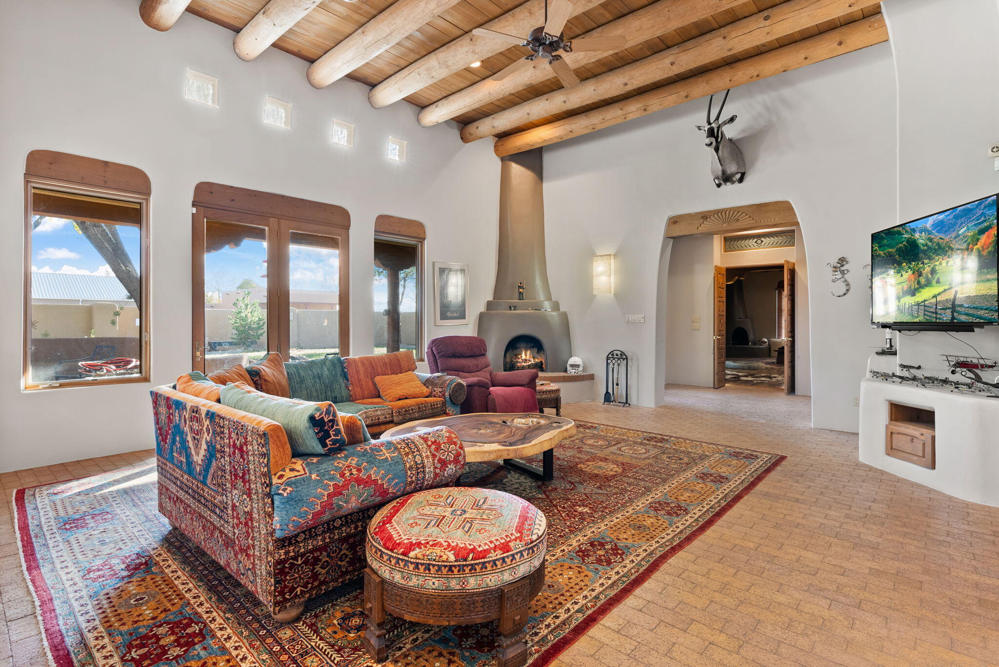 Atrium, Beamed Ceilings, Bookcases, Ceiling Fan(s), Dressing Area, Entrance Foyer, French Door(s)/Atrium Door(s), In-Law Floorplan, Kitchen Island, Multiple Living Areas, Main Level Primary, Pantry, Skylights, Separate Shower, Cable TV, Walk-In Closet(s)